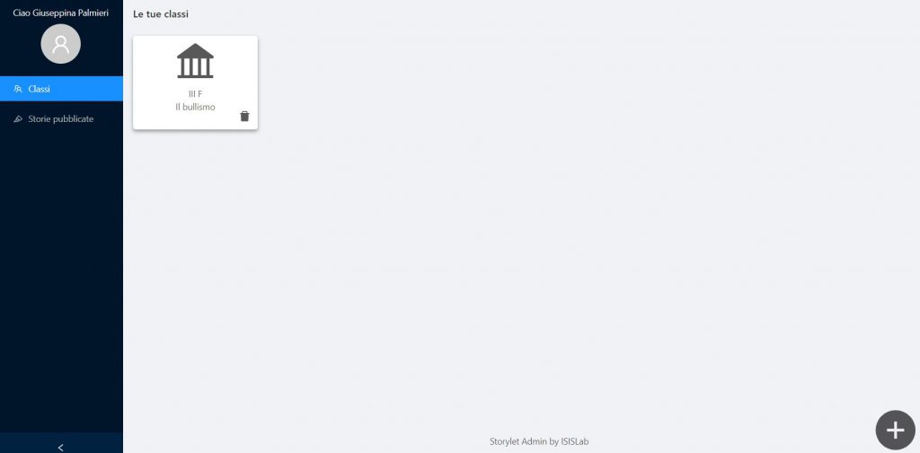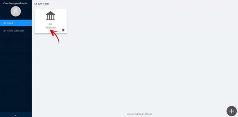 La sezione “Classi” visualizza le classi create e cliccando su una specifica di esse si può accedere alle schede: “Studenti” e “Storie”.